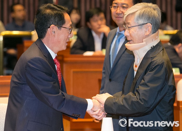 (서울=포커스뉴스) 9일 오전 서울 여의도 국회에서 국회 부의장 후보 선출을 위해 열린 새누리당 의원총회에 참석한 김도읍(왼쪽) 원내수석부대표와 여상규 의원이 인사하고 있다. 여 의원은 지난달 10일 차량 교통사고로 치료 중이다.