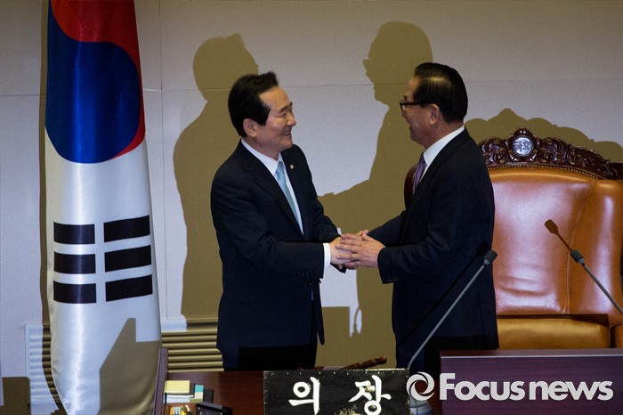 (서울=포커스뉴스) 9일 오후 서울 여의도 국회에서 열린 본회의에서 20대 국회 전반기 국회의장으로 선출된 정세균 더불어민주당 의원이 수락 연설을 마친 뒤 서청원 임시 국회의장과 악수 하고 있다.