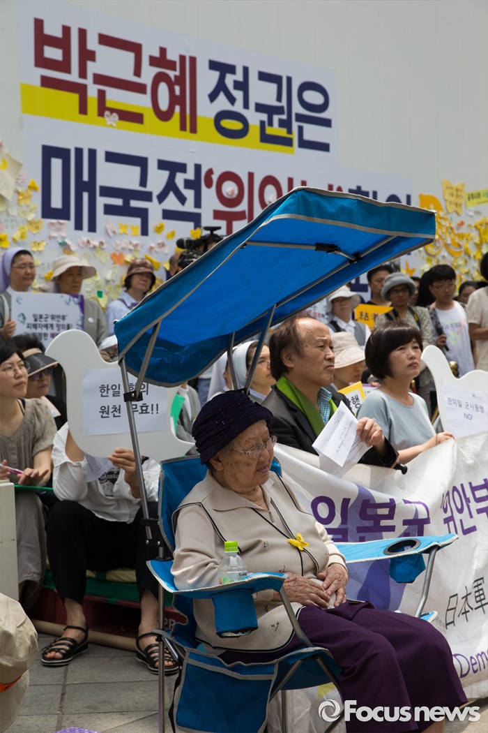 (서울=포커스뉴스) 8일 오후 서울 종로구 옛 일본대사관 앞에서 열린 제 1234차 일본군 위안부 문제해결을 위한 정기 수요시위에서 길원옥 할머니가 사회자의 발언을 듣고 있다.