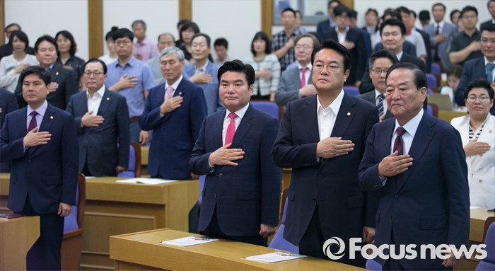 (서울=포커스뉴스) 8일 오전 서울 여의도 국회 의원회관에서 열린 국가미래전략포럼(일명 알파포럼) 창립총회 및 강연회에 참석한 서청원(앞줄 오른쪽부터) 새누리당 전 최고위원, 정진석 원내대표, 원유철 전 원내대표 등 참석자들이 국기에 대한 경례를 하고 있다. 이날 정 원내대표와 서 전 최고위원은 국회의장직을 야당에 양보한다는 뜻을 밝혔다.
