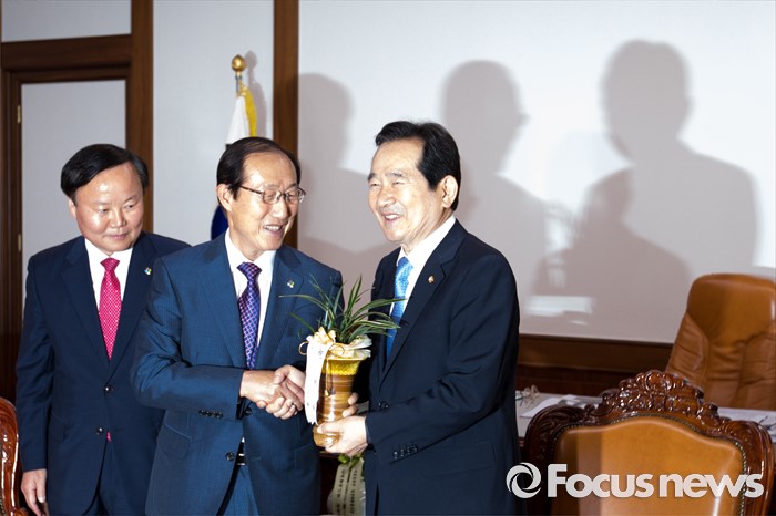 (서울=포커스뉴스) 이원종(가운데) 대통령비서실장과 김재원(왼쪽) 청와대 정무수석이 10일 오전 서울 여의도 국회에서 정세균 국회의장을 예방해 박근혜 대통령의 축하 난을 전달 하고 있다.