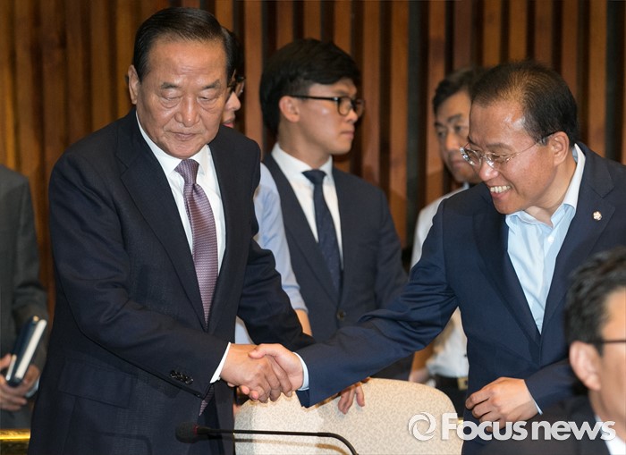 (서울=포커스뉴스) 9일 오전 서울 여의도 국회에서 국회 부의장 후보 선출을 위해 열린 새누리당 의원총회에 참석한 서청원(왼쪽) 전 최고위원이 윤재옥 의원과 인사하고 있다.