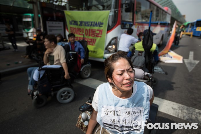 (서울=포커스뉴스) 8일 오후 서울 영등포구 여의도 환승센터 앞에서 경기장애인차별철폐공동투쟁단원들이 장애인 이동권 보장을 촉구하며 경기도행 버스를 막아서고 구호를 외치고 있다.