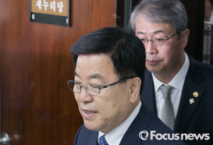 (서울=포커스뉴스) 9일 오전 서울 여의도 국회에서 열린 산업·기업 구조조정 관련 당정간담회에 김광림(왼쪽) 새누리당 정책위의장과 임종룡 금융위원장이 참석하고 있다.