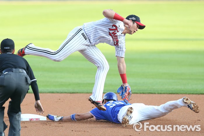 (서울=포커스뉴스) 8일 서울 잠실구장에서 열린 2016 프로야구 삼성-LG 경기 1회초 1사 1루에서 삼성 이승엽이 삼진 아웃되는 사이에 1루주자 박해민이 2루 도루를 시도하다 LG 유격수 오지환에게 태그아웃되고 있다.