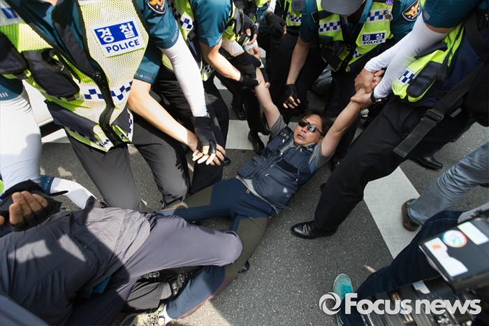(서울=포커스뉴스) 사내하청 전원 정규직화를 요구하며 고공농성을 벌여온 기아자동차 사내하청 노동자 최정명씨와 한규협씨가 농성을 중단한 8일 오후 서울 중구 옛 국가인권위원회 건물 옥상 광고탑 농성장에서 내려와 병원으로 이동하던 중 경찰과 노조원들이 실랑이를 벌이고 있다.