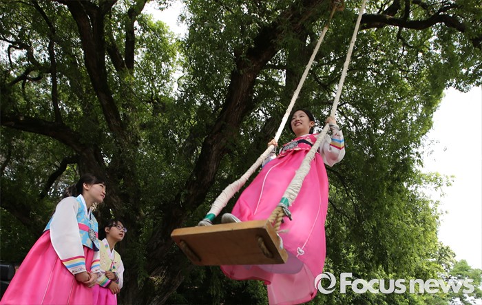 (대전=포커스뉴스) 9일 오후 (음력5월5일) 단오를 맞아 대전 동구 쌍청당공원에서 열린 판암골 단오한마당에서 한복입은 여학생이 그네뛰기를 하고 있다