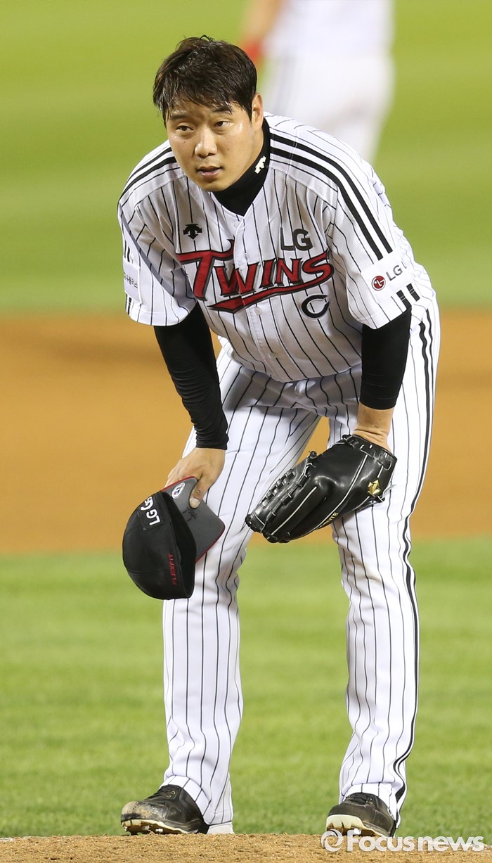 (서울=포커스뉴스) 8일 서울 잠실구장에서 열린 2016 프로야구 삼성-LG 경기 6회 2사후 LG 투수 류제국이 투수교체를 기다리며 숨을 고르고 있다.