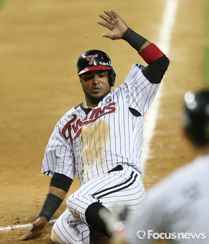 (서울=포커스뉴스) 8일 서울 잠실구장에서 열린 2016 프로야구 삼성-LG 경기 4회말 1사 만루에서 LG 유강남의 좌익수 희생플라이때 3루주자 히메네스가 슬라이딩하며 홈인하고 있다.