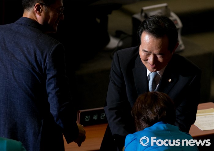 (서울=포커스뉴스) 9일 오후 서울 여의도 국회에서 열린 20대 국회 첫 본회의에서 전반기 국회의장으로 공식 선출된 정세균 더불어민주당 의원이 동료 의원들의 축하를 받고 있다.