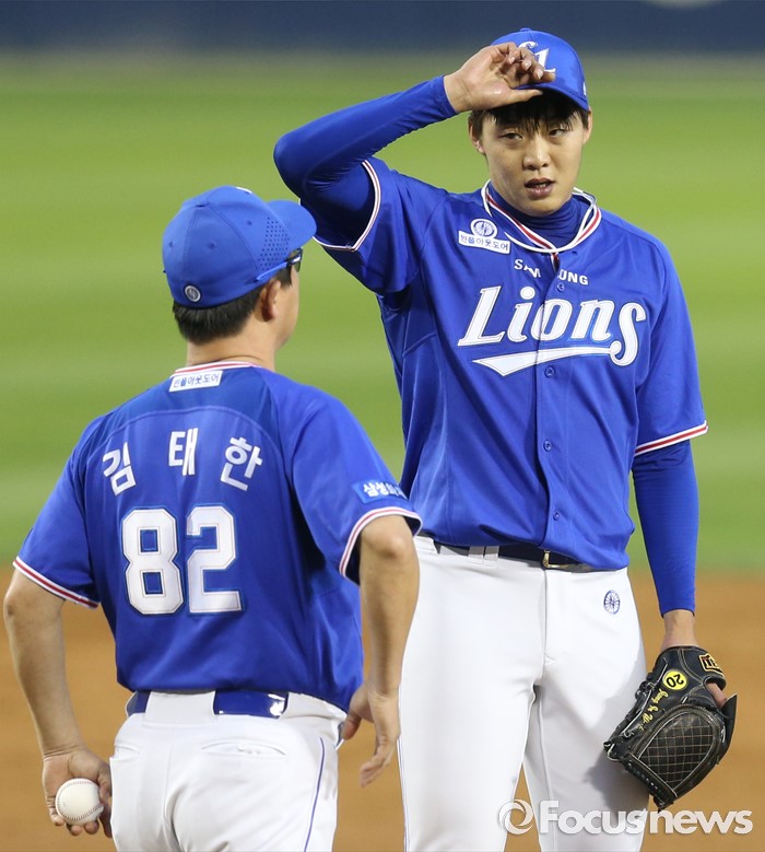 (서울=포커스뉴스) 8일 서울 잠실구장에서 열린 2016 프로야구 삼성-LG 경기에서 삼성 투수 정인욱이 3회에 4실점하자 김태한 코치가 투수 교체를 위해 마운드에 올라가고 있다.