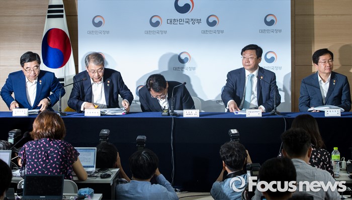 (서울=포커스뉴스) 8일 오전 서울 종로구 정부서울청사에서 이기권(왼쪽부터) 고용노동부 장관, 임종룡 금융위원장, 유일호 부총리 겸 기획재정부 장관, 주형환 산업통상자원부 장관, 김영석 해양수산부 장관이 구조조정 추진현황 및 계획에 대해 발표를 마친 후 자리를 나서고 있다.