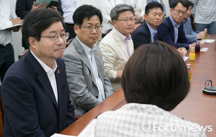 (서울=포커스뉴스) 심상정(뒷모습) 정의당 상임대표가 10일 오후 서울 여의도 국회에서 지방재정법 시행령과 관련 경기도 기초단체장들과 만나 간담회를 하고 있다. 왼쪽부터 염태영 수원시장, 최성 고양시장, 채인석 화성시장.