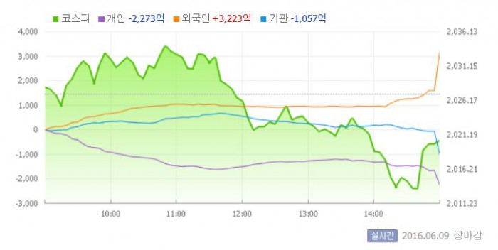 이날 코스피는 전일 대비 0.02% 오른 2028.02로 장을 시작했다. 이후 지수는 상승세를 이어가며 2033.24를 기록, 연중 최고가를 경신했다. 그러나 오후 들어 개인과 기관의 동반 매도세에 하락세로 방향을 바꿨다.