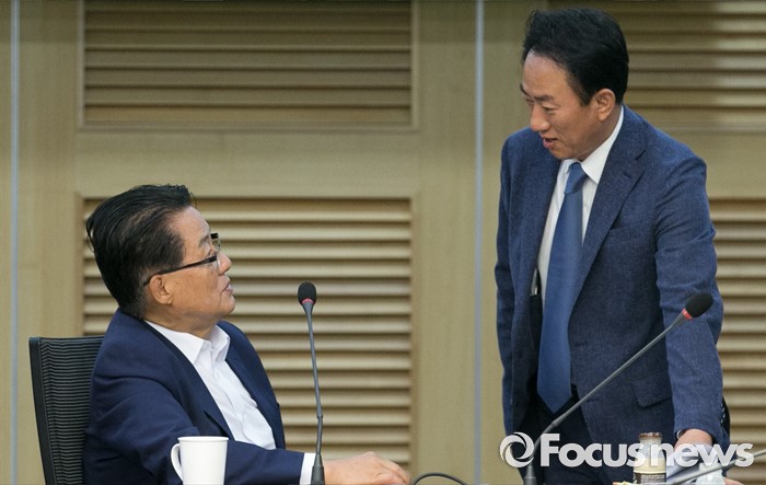 (서울=포커스뉴스) 8일 오전 서울 여의도 국회 의원회관에서 열린 국민의당 12차 정책역량강화 워크숍에 참석한 박지원(왼쪽) 원내대표와 김명진 원내대표비서실장이 대화하고 있다.
