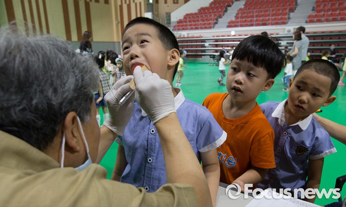 (대전=포커스뉴스) 9일 오전 구강보건의 날을 맞아 대전치과의사회 소속 치과의사들이 대전 서구 대전과학기술대학교에서 어린이집과 유치원 아동 5000여 명을 대상으로 무료 구강검진을 하고 있다.