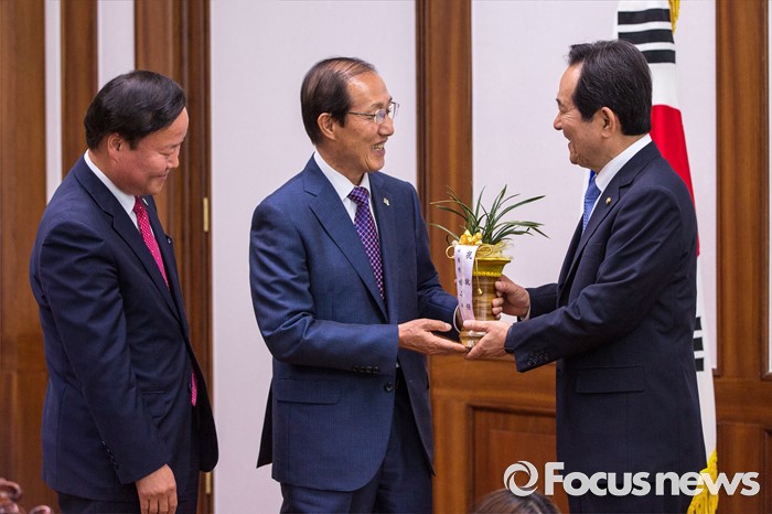 (서울=포커스뉴스) 이원종(가운데) 대통령비서실장이 10일 오전 서울 여의도 국회에서 정세균 국회의장을 예방해 박근혜 대통령의 축하 난을 전달 하고 있다.