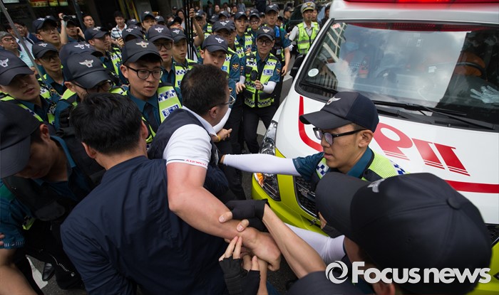 (서울=포커스뉴스) 사내하청 전원 정규직화를 요구하며 고공농성을 벌여온 기아자동차 사내하청 노동자 최정명씨와 한규협씨가 농성을 중단한 8일 오후 서울 중구 옛 국가인권위원회 건물 옥상 광고탑 농성장에서 내려와 병원으로 이동하던 중 경찰과 노조원들이 실랑이를 벌이고 있다.