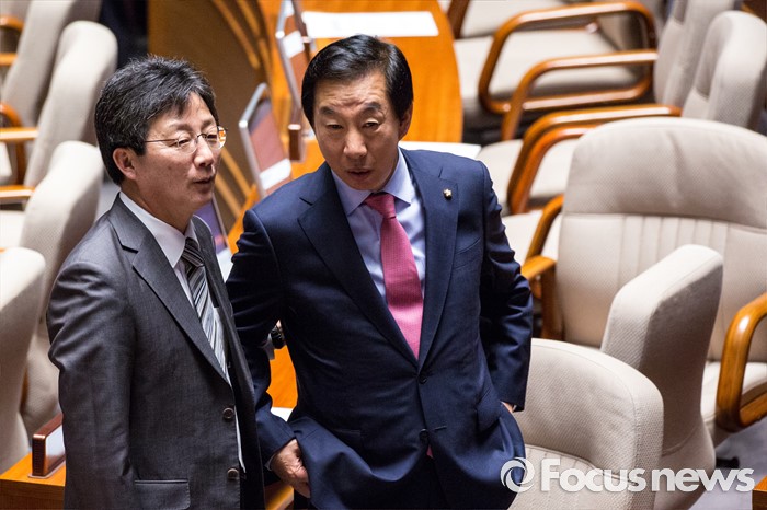 (서울=포커스뉴스) 김성태 새누리당 의원과 유승민 무소속 의원이 9일 오후 서울 여의도 국회에서 열린 본회의에 참석해 대화를 나누고 있다.