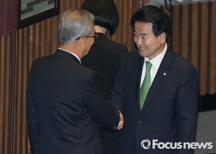 (서울=포커스뉴스) 9일 오후 서울 여의도 국회에서 열린 20대 국회 첫 본회의에 참석한 김종인(왼쪽) 더불어민주당 비대위 대표와 정동영 국민의당 의워이 인사하고 있다.
