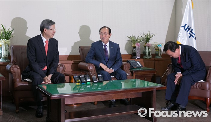 (서울=포커스뉴스) 김희옥(왼쪽) 새누리당 혁신비대위원장이 10일 오후 서울 여의도 당사를 방문한 이원종(가운데) 대통령비서실장, 김재원 청와대 정무수석과 면담을 하고 있다.