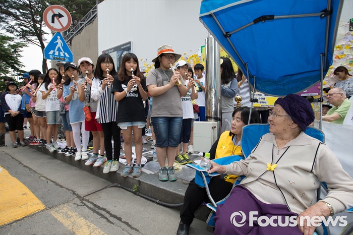 (서울=포커스뉴스) 8일 오후 서울 종로구 옛 일본대사관 앞에서 열린 제 1234차 일본군 위안부 문제해결을 위한 정기 수요시위에 참석한 초등학교 학생들이 길원옥 할머니 앞에서 리코더 공연을 선보이고 있다.