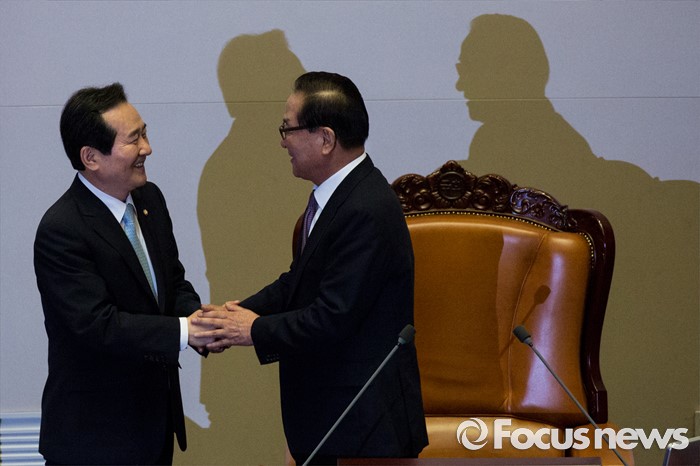 (서울=포커스뉴스) 9일 오후 서울 여의도 국회에서 열린 본회의에서 20대 국회 전반기 국회의장으로 선출된 정세균 더불어민주당 의원이 수락 연설을 마친 뒤 서청원 임시 국회의장과 악수 하고 있다.
