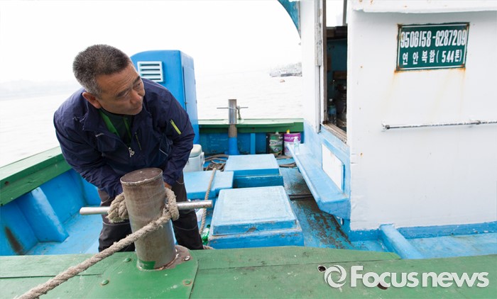 (서울=포커스뉴스) 10일 오후 서울 성동구 뚝도나루에서 박태원 연평면 어촌계장이 어선을 고정시키고 있다. 6월부터 8월까지 2, 4주 금요일에 뚝도시장에 수산물 장서는 날을 운영하며 9월부터는 7일장 형태로 상설운영 할 예정이다.
