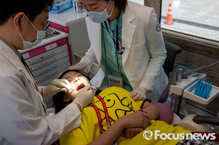 (서울=포커스뉴스) 9일 오전 서울 청계광장에서 열린 제1회 서울시민 구강보건의 날 기념행사에 참석한 어린이들이 이동 치아검진을 받고 있다.
