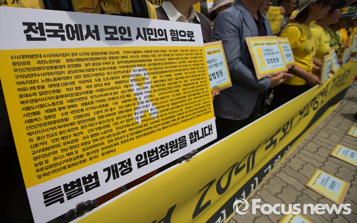 (서울=포커스뉴스) 8일 오전 서울 여의도 국회 앞에서 4.16가족협의회와 4.16연대 관계자들이 세월호 진상규명 특별법 개정 입법청원 기자회견을 하고 있다.