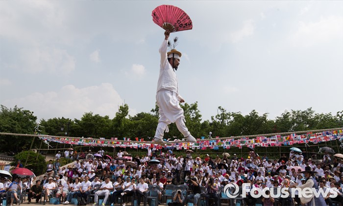 (서울=포커스뉴스) 9일 오후 단오 세시풍속을 체험하기 위해 서울 중구 남산 한옥마을을 방문한 중국 관광객들이 외줄타기를 관람하고 있다.