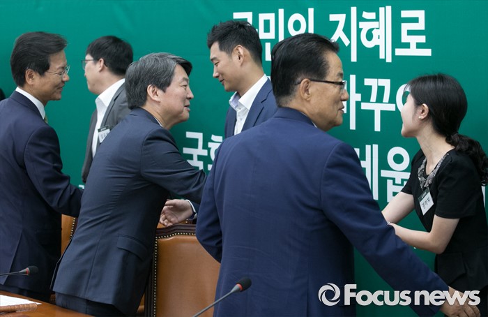(서울=포커스뉴스) 8일 오전 서울 여의도 국회에서 열린 국민의당 최고위원회의에 참석한 천정배(왼쪽부터) 공동대표, 안철수 상임공동대표, 박지원 원내대표가 신임 당직자들과 인사하고 있다.