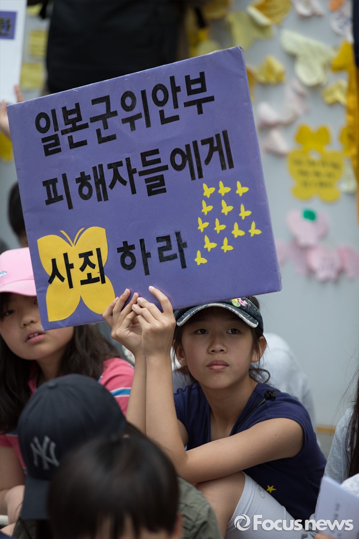 (서울=포커스뉴스) 8일 오후 서울 종로구 옛 일본대사관 앞에서 열린 제 1234차 일본군 위안부 문제해결을 위한 정기 수요시위에 참석한 학생들이 피켓을 들고 있다.