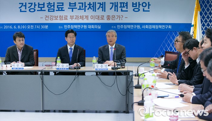 (서울=포커스뉴스) 8일 오전 서울 여의도 민주정책연구원에서 '건강보험 부과체계 개편 방안' 주제로 열린 사회경제포럼에 참석한 김종인 더불어민주당 비대위 대표가 인사말을 하고 있다. 왼쪽부터 이진석 서울대 의대 교수, 양승조 의원, 김 대표.