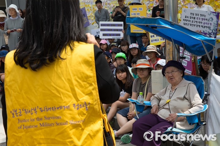 (서울=포커스뉴스) 8일 오후 서울 종로구 옛 일본대사관 앞에서 열린 제 1234차 일본군 위안부 문제해결을 위한 정기 수요시위에서 길원옥 할머니가 사회자의 발언을 듣고 있다.