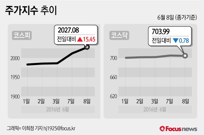 (서울=포커스뉴스) 8일 코스피지수는 전날 보다 0.77%(15.45포인트) 오른 2027.08에 장을 마쳤다. 코스닥지수는 전일 대비 0.11%(0.78포인트) 내린 703.99에 마감했다.