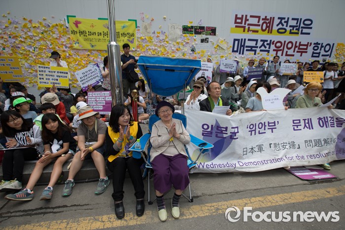 (서울=포커스뉴스) 8일 오후 서울 종로구 옛 일본대사관 앞에서 열린 제 1234차 일본군 위안부 문제해결을 위한 정기 수요시위에서 길원옥 할머니가 안김정애 평화를 만드는여성회 상임대표 인사말을 듣고 박수를 치고 있다.