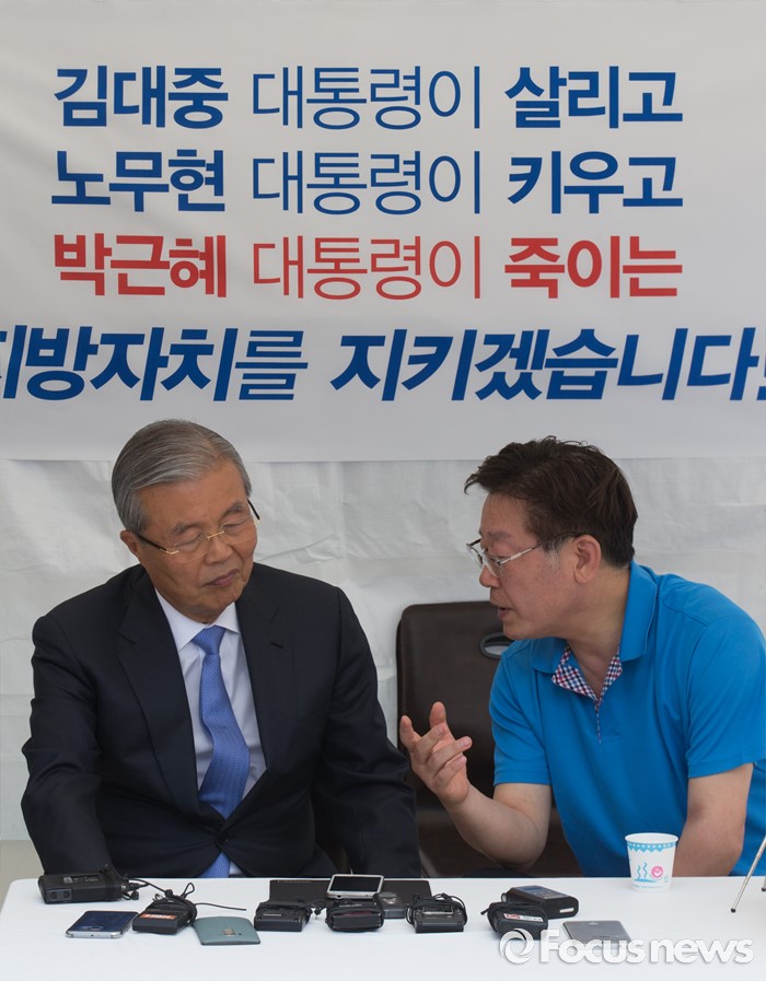 (서울=포커스뉴스) 김종인(왼쪽) 더불어민주당 비상대책위원회 대표가 8일 오후 서울 광화문광장에서 지방재정제도 개편을 반대하며 무기한 단식농성 중인 이재명 성남시장을 만나 대화하고 있다.