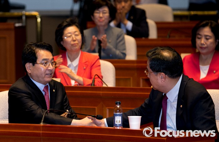 (서울=포커스뉴스) 9일 오후 서울 여의도 국회에서 국회 부의장 후보 선출을 위해 열린 새누리당 의원총회에 참석한 심재철(왼쪽) 의원이 김정훈 의원의 축하를 받고 있다. 심 의원은 이날 새누리당 소속 국회 부의장 후보에 선출됐다.