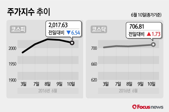 (서울=포커스뉴스) 10일 코스피지수는 전날 보다 0.32%(6.54포인트) 내린 2,017.63에 장을 마쳤다. 코스닥지수는 전일 대비 0.25%(1.73포인트) 오른 706.81에 마감했다.