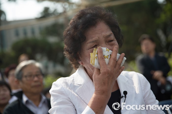 (서울=포커스뉴스) 9일 오후 서울 서대문구 연세대학교 정문 앞에서 열린 '제29주기 이한열 열사 동판 제막식에 참석한 배은심 이한열 열사의 어머니가 눈물을 훔치고 있다.