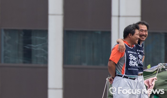 (서울=포커스뉴스) 8일 오후 서울 을지로 옛 국가인권위원회 옥상 광고탑에서 기아자동차 비정규직 노동자의 정규직화를 요구하며 363일 동안 고공농성을 벌인 한규협(왼쪽)씨와 최정명씨가 밝게 웃고 있다.