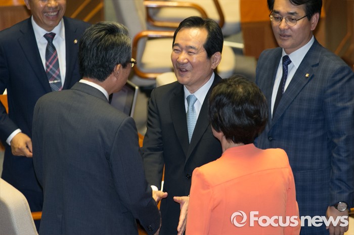 (서울=포커스뉴스) 9일 오후 서울 여의도 국회에서 열린 20대 국회 첫 본회의에 참석한 정세균 더불어민주당 의원이 동료 의원들과 인사하고 있다. 이날 정 의원은 20대 국회 전반기 국회의장으로 공식 선출됐다.