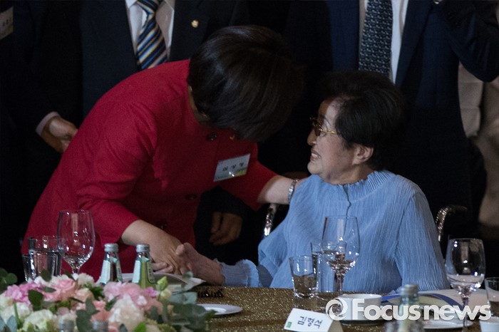(서울=포커스뉴스) 9일 오후 서울 여의도구 63빌딩 그랜드볼룸에서 열린 '6.15 남북정상회담 16주년 기념식'에 참석한 심상정 정의당 대표(왼쪽)와 이희호 여사가 악수하고 있다.