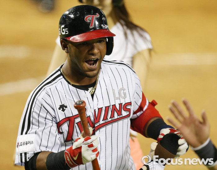 (서울=포커스뉴스) 9일 서울 잠실구장에서 열린 2016 프로야구 삼성-LG 경기 5회말 2사 1루에서 LG 히메네스가 좌월 2점 홈런을 치고 동료의 환영을 받으며 환호하고 있다.