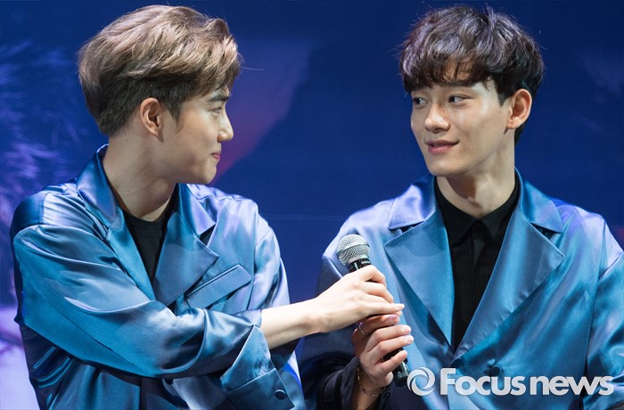 (서울=포커스뉴스) 8일 오전 서울 강남구 코엑스 아티움에서 열린 아이돌 그룹 엑소의 3집 앨범 'EX'ACT' 발표 쇼케이스에 참석한 멤버 수호(왼쪽)가 첸에게 마이크를 건내고 있다.