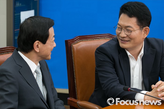 (서울=포커스뉴스) 8일 오후 서울 여의도 국회 더불어민주당 원내대표실에서 새누리당의 국회의장직을 야당이 맡고 운영 및 법사위를 여당이 맡자는 제안과 관련 논의를 위해 진행된 우상호 원내대표와 4선 이상 중진 의원과의 간담회에 참석한 송영길(오른쪽), 진영 의원이 대화하고 있다.