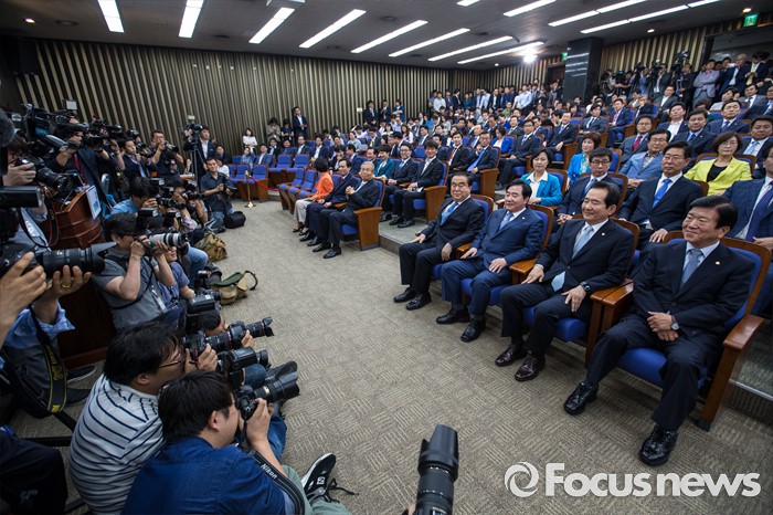 (서울=포커스뉴스) 9일 오전 서울 여의도 국회에서 열린 의원총회에 참석한 국회의장 후보들이 투표 시작을 기다리고 있다. 오른쪽부터 박병석 의원, 정세균 의원, 이석현 의원, 문희상 의원.