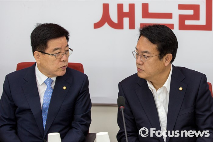 (서울=포커스뉴스) 정진석(오른쪽) 새누리당 원내대표와 김광림 정책위의장이 8일 오전 서울 여의도 국회에서 열린 원내대책회의에 참석해 대화를 나누고 있다.