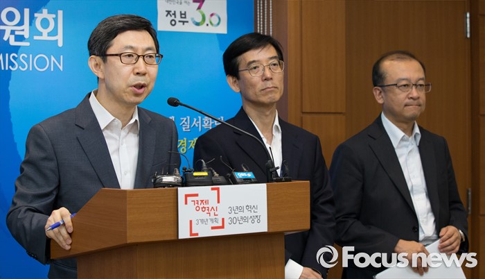 (세종=포커스뉴스) 신영선 공정거래위원회 사무처장이 8일 오전 세종시 정부세종청사 공정위 기자실에서 대기업집단 지정제도 개선방안에 대한 브리핑을 하고 있다. 왼쪽부터 신영선 사무총장, 김병근 중소기업청 중소기업정책국장, 원동진 산업통상자원부 산업정책관.